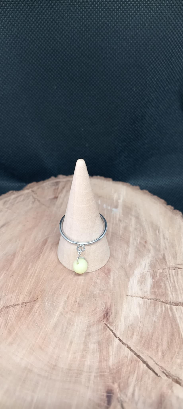 Bague breloque en acier inoxydable réglable couleur argent . Monté à la mains d'une perle en pierre naturelle: jade citron